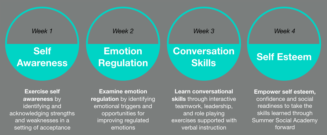 The Summer Social Academy is a four-week intensive social skill building and self awareness group program launching on August 17th, 2022 for various age groups. Each section of the program has an age-specific curriculum tailored to (1) Pre-K, (2) Elementary School, (3) Middle School, and (4) High School. The Summer Social Academy aims to provide a safe environment to foster social skills amongst peers to practice self awareness, emotion regulation and conversation skills to improve self esteem.